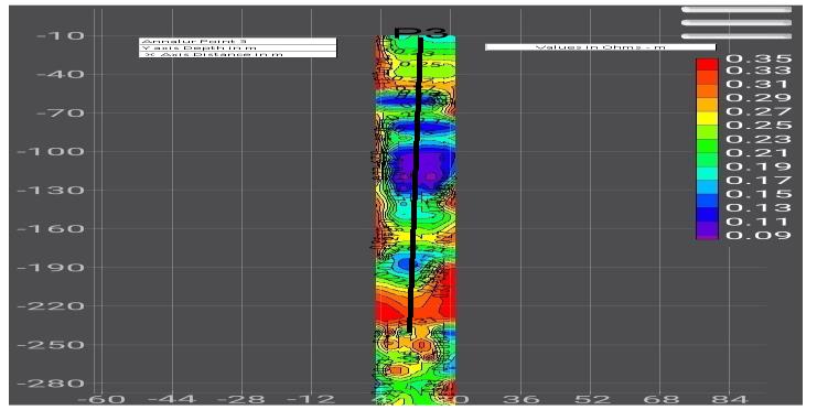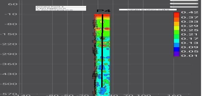 Lowest resistivity is observed at this location ranging between 0.09 to 0.13 ohm-m and indicates weathered fractured rock presence with saturation.