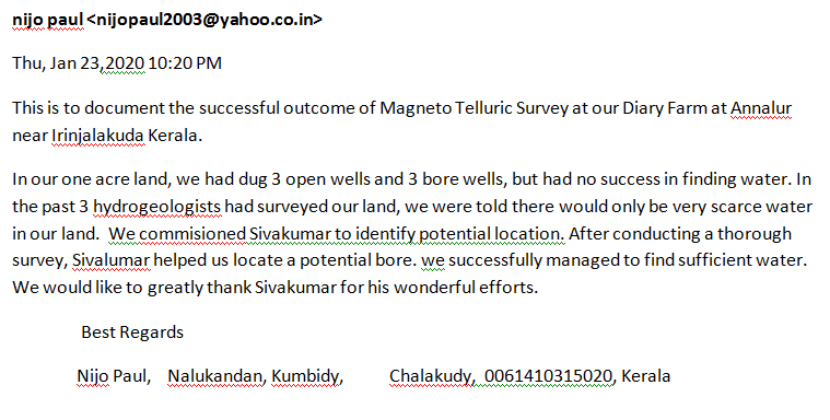 Drilling was conducted immediately at Location 3 gave a high yield of around 12000 litres per hour. Good yield was observed between 100 to 120 m depth as inferred from Magneto Telluric results. The letter from the owner of the Farm is shown below