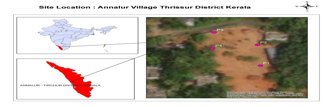The application of Magneto Telluric survey was conducted at Annalur Area near Irinjalakuda in Trichur district . The study area is a one acre and is a dairy farm. The farm had tried few poor yielding borewells and was not able to meet its daily requirements. Earlier ground water surveys were not successful in the area. The study location is shown in Fig. 1